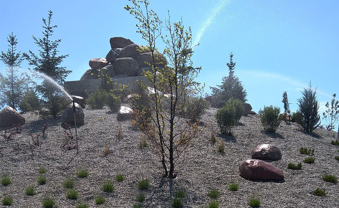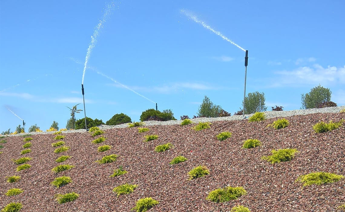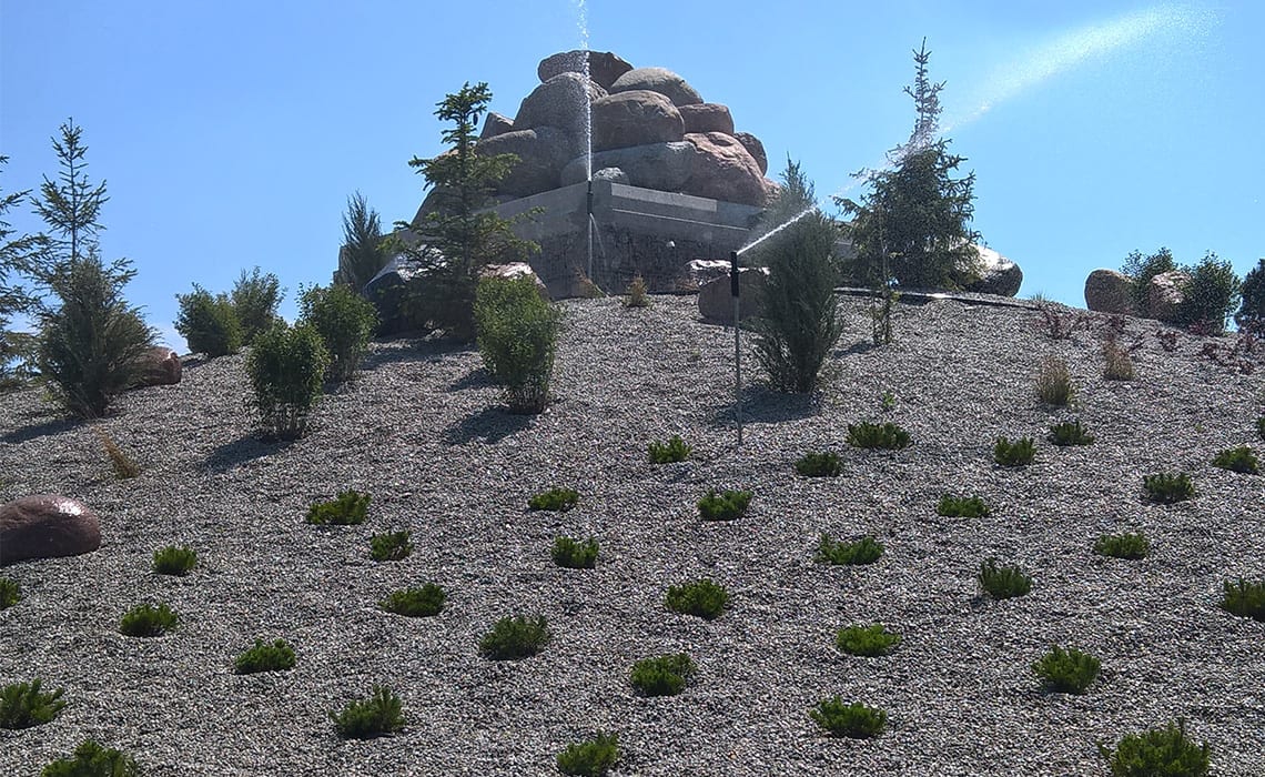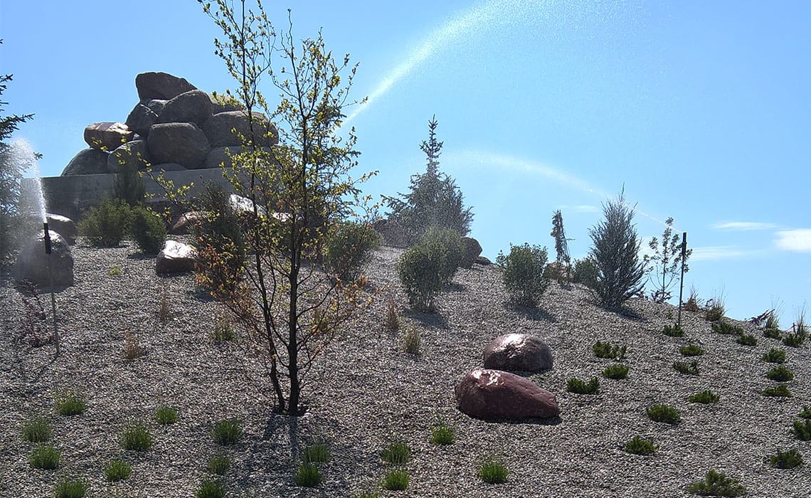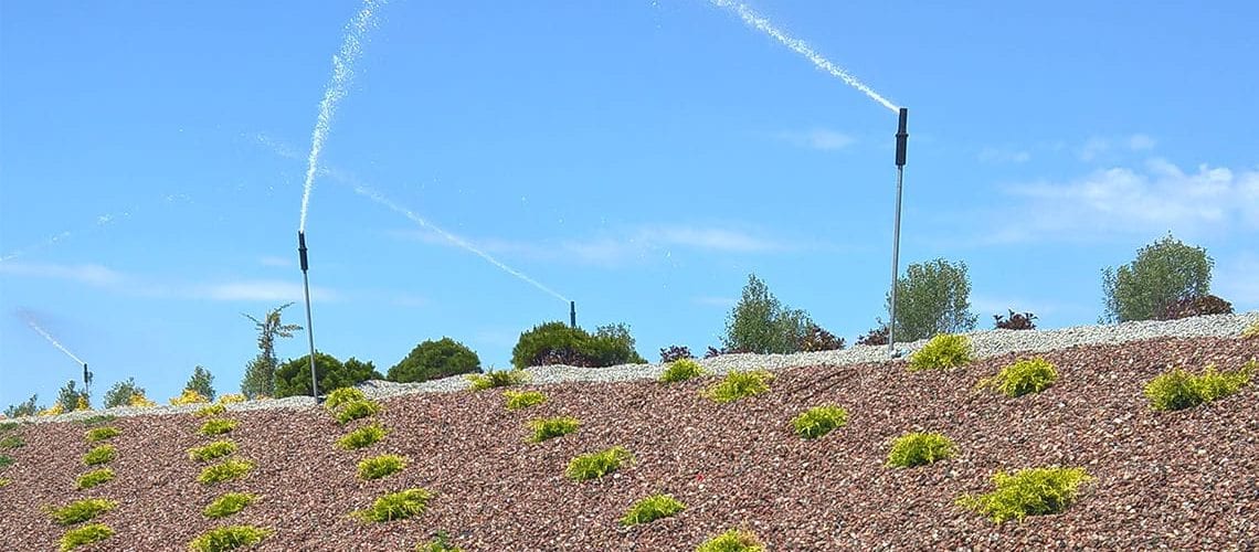 Do podlania kaskady w Łojewie koło Inowrocławia, obsadzonej wysoką roślinnością zastosowano zraszacze Hunter PGP i Rain Bird 6005 Falcon na rurkach wystających 1 m nad powierzchnię żeby rozrastające się rośliny nie zasłaniały strumienia wody zraszacza. Cała góra ma wysokość ok 15 metrów i szerokość strumienia kaskady w dolnej części to także 15 metrów. Do sterowania pompą kaskady i podlewania zastosowaliśmy system radiowy uruchamiany pilotem z odległości 250 metrów.