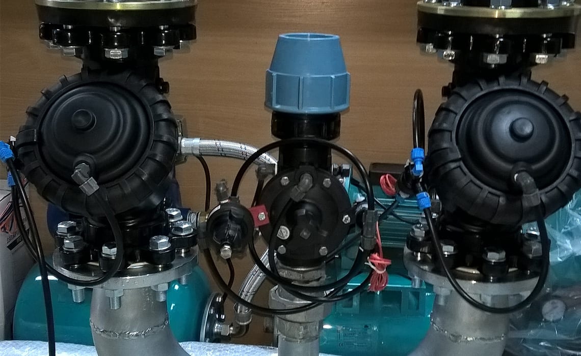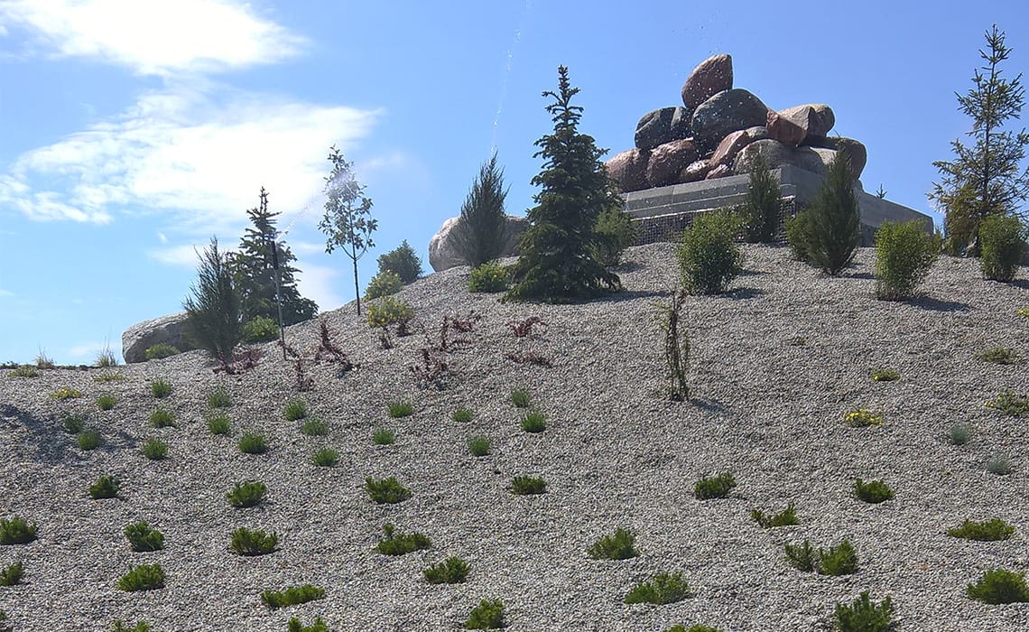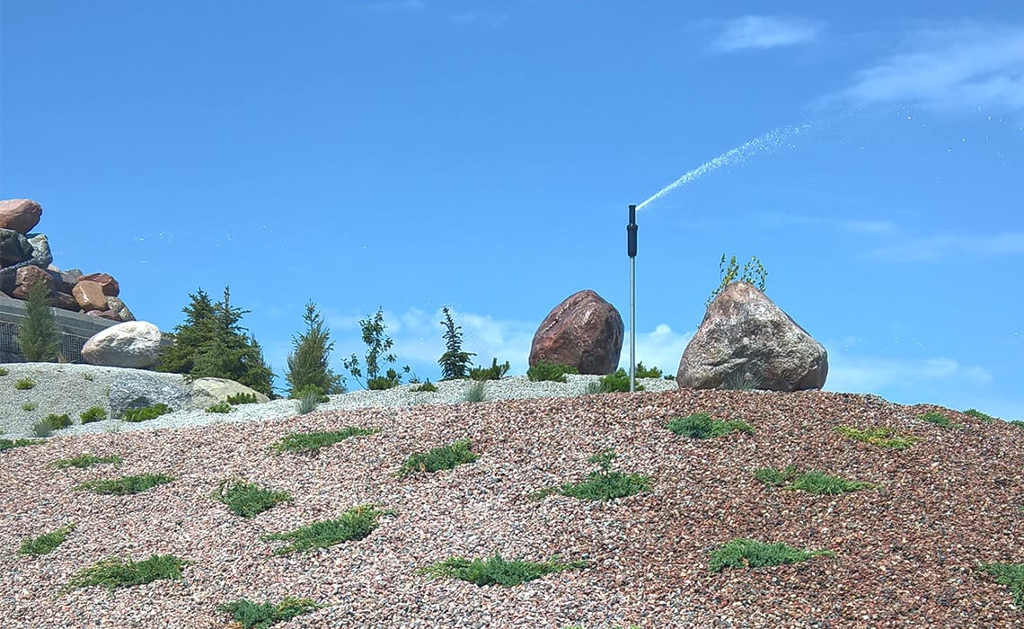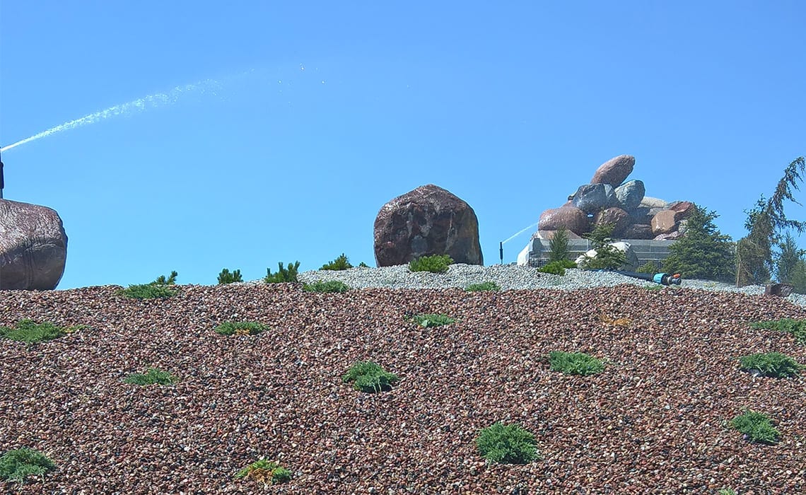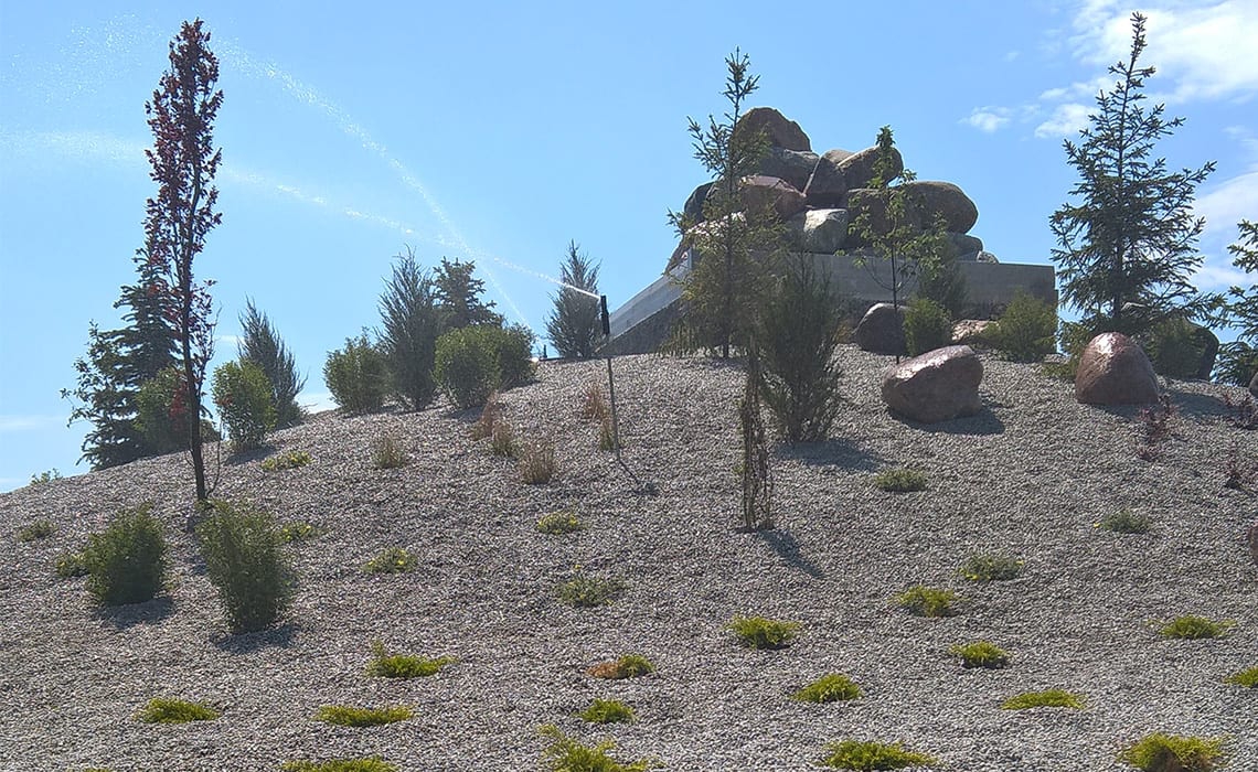Do podlania kaskady w Łojewie koło Inowrocławia, obsadzonej wysoką roślinnością zastosowano zraszacze Hunter PGP i Rain Bird 6005 Falcon na rurkach wystających 1 m nad powierzchnię żeby rozrastające się rośliny nie zasłaniały strumienia wody zraszacza. Cała góra ma wysokość ok 15 metrów i szerokość strumienia kaskady w dolnej części to także 15 metrów. Do sterowania pompą kaskady i podlewania zastosowaliśmy system radiowy uruchamiany pilotem z odległości 250 metrów.