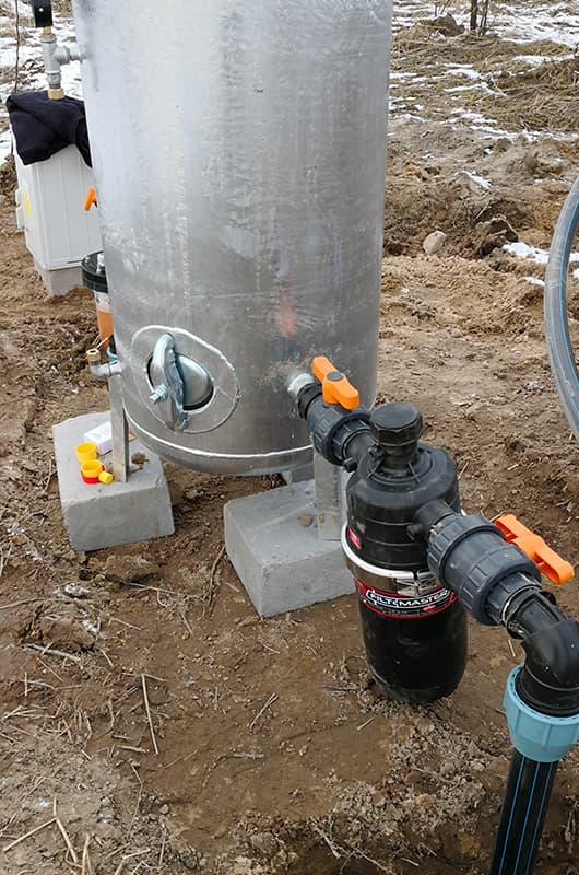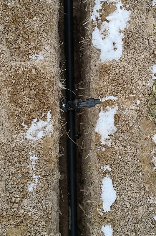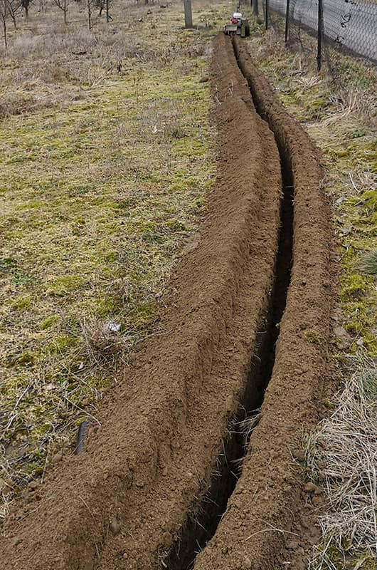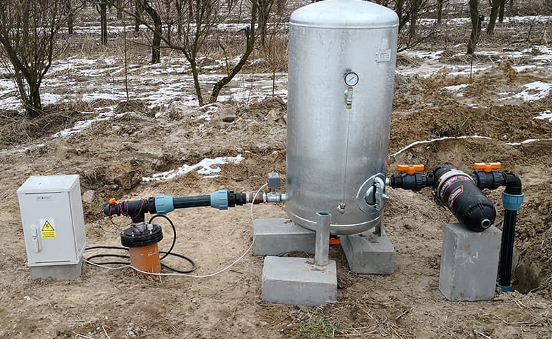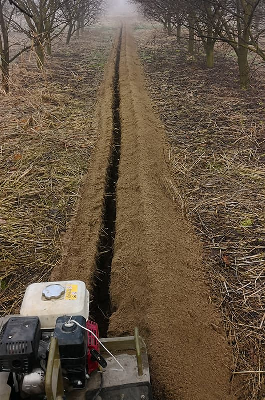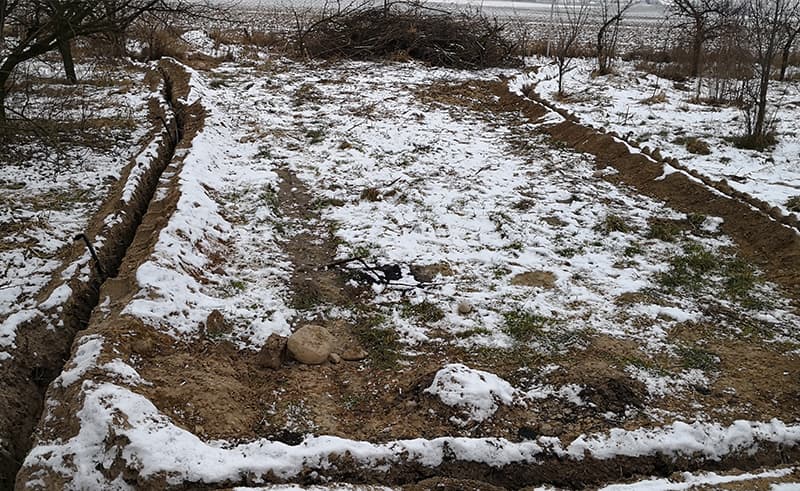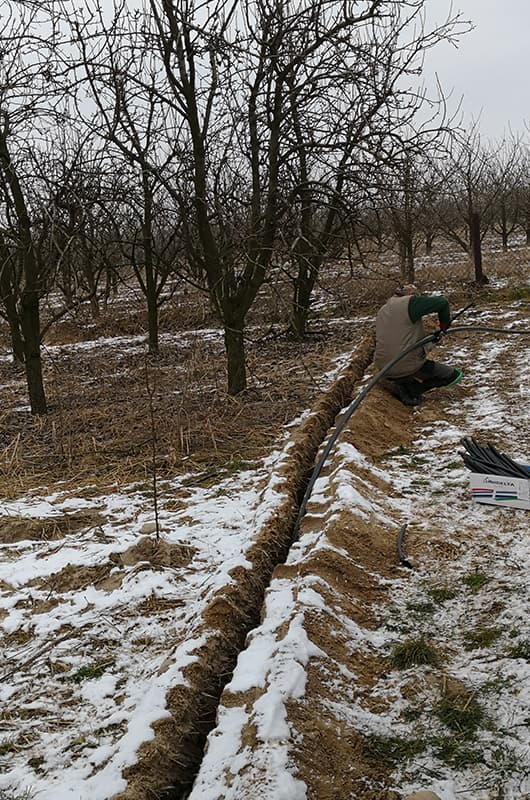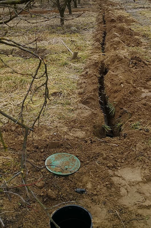 Nieduży sad pestkowy wielogatunkowy. Realizacja tej inwestycji rozpoczęła się w styczniu, przerwaliśmy na dwa tygodnie ze względu na mrozy i skończyliśmy do połowy marca. Do wykopanej studni zamontowaliśmy pompę głębinową w układzie hydroforowym. Sterownik obsługiwany z gospodarstwa. Zainstalowano ujęcie wody do opryskiwacza. Latem z tego samego źródła wody i sterowania, zainstalowano nawadnianie przy domu.