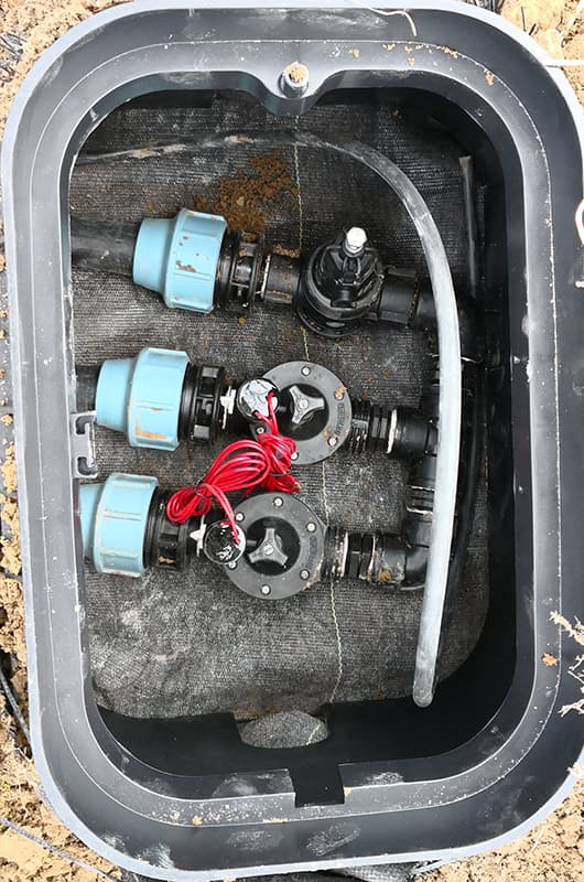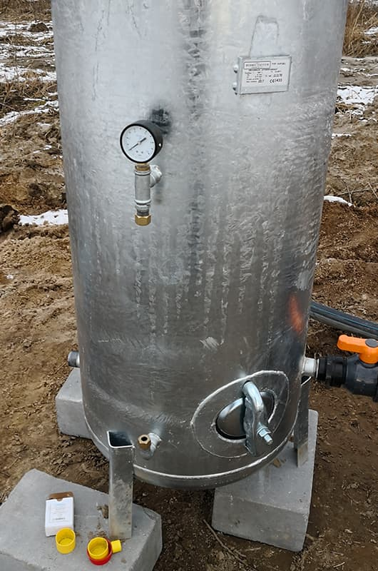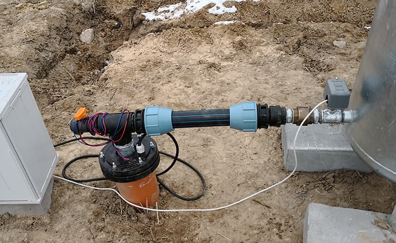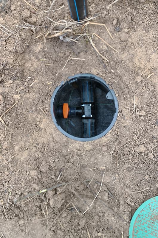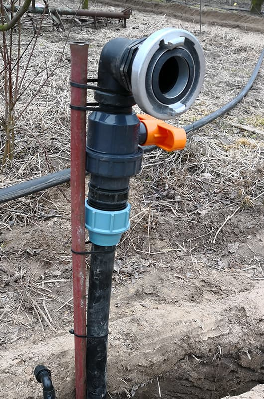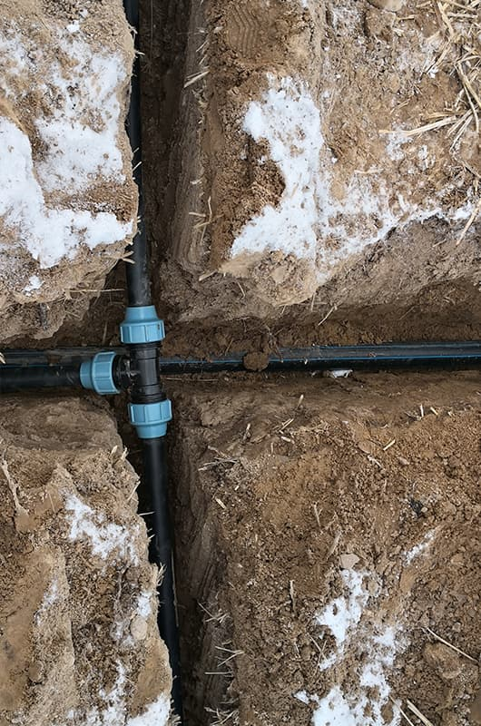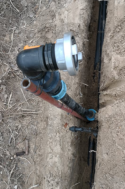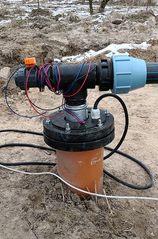Nieduży sad pestkowy wielogatunkowy. Realizacja tej inwestycji rozpoczęła się w styczniu, przerwaliśmy na dwa tygodnie ze względu na mrozy i skończyliśmy do połowy marca. Do wykopanej studni zamontowaliśmy pompę głębinową w układzie hydroforowym. Sterownik obsługiwany z gospodarstwa. Zainstalowano ujęcie wody do opryskiwacza. Latem z tego samego źródła wody i sterowania, zainstalowano nawadnianie przy domu.