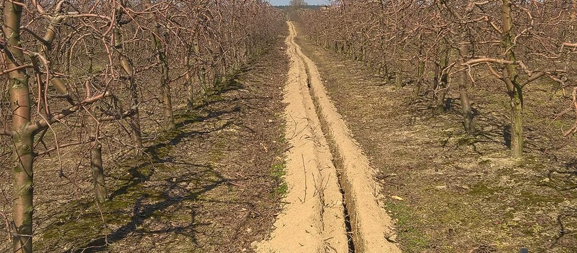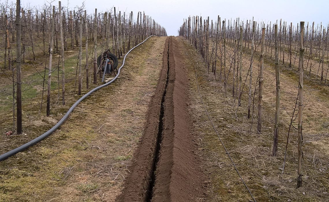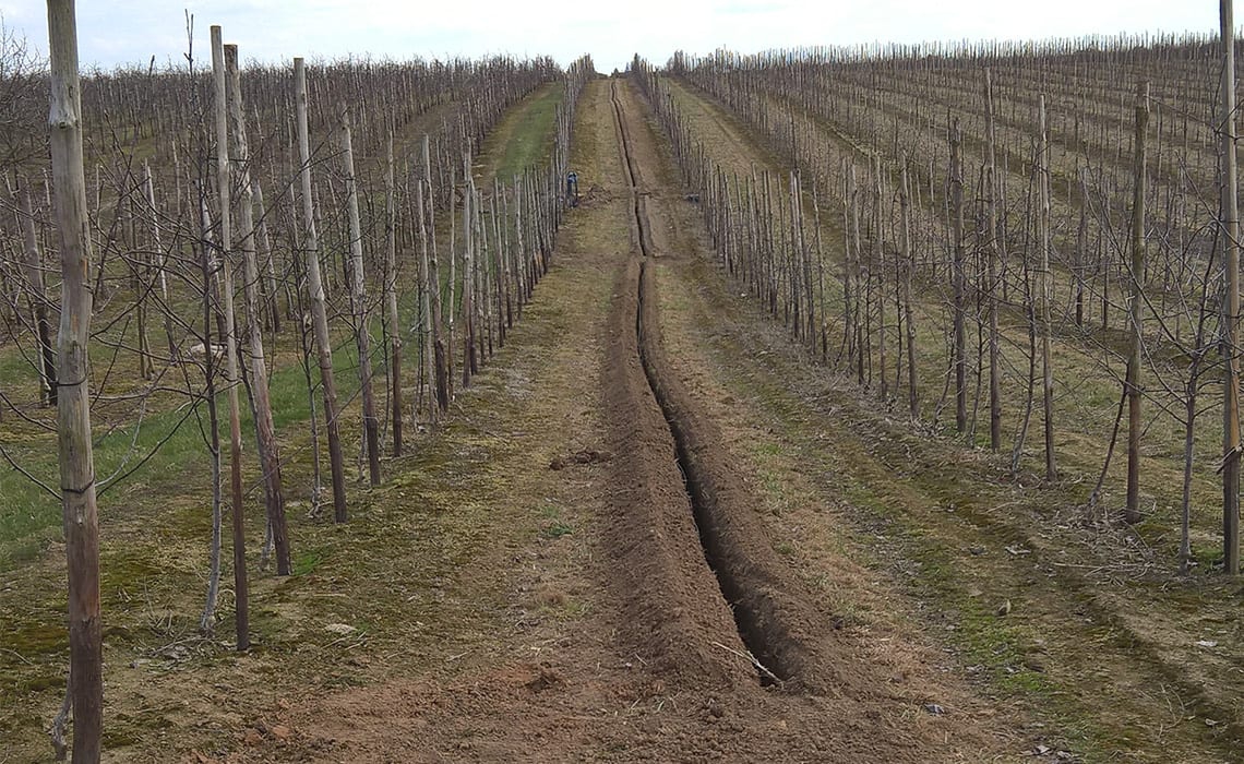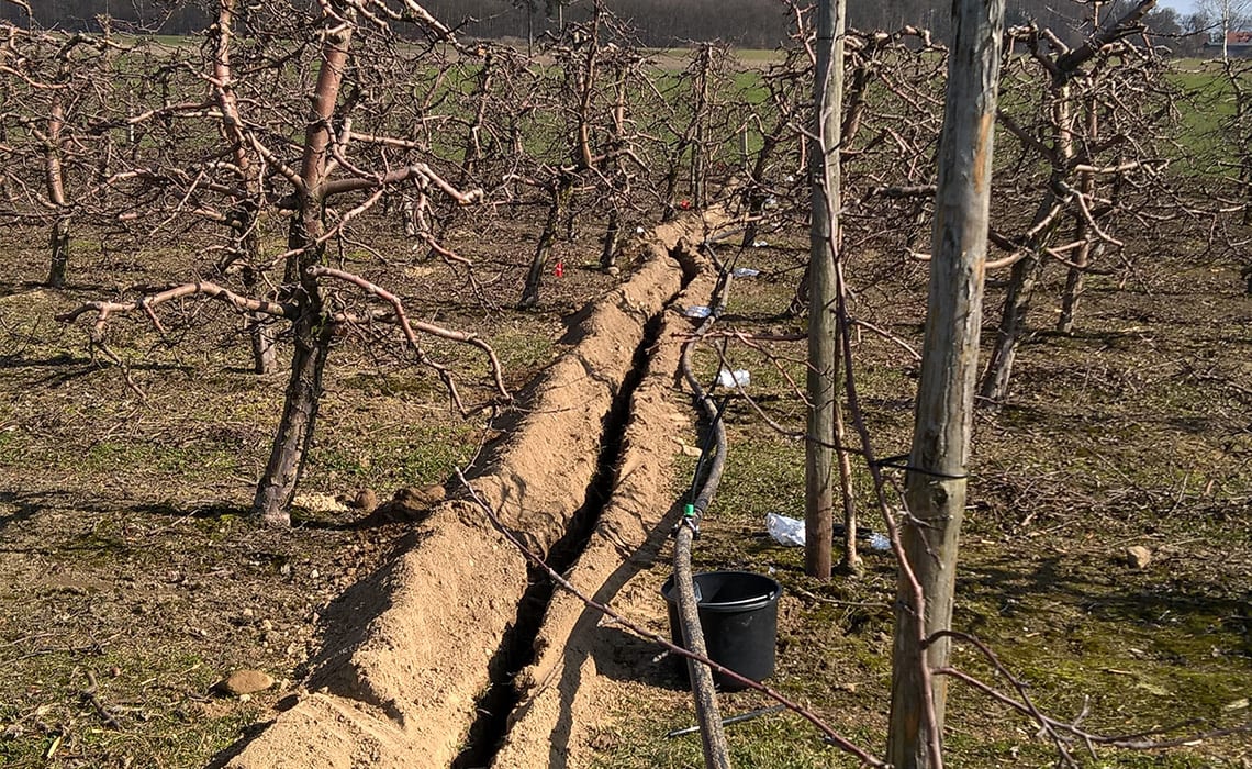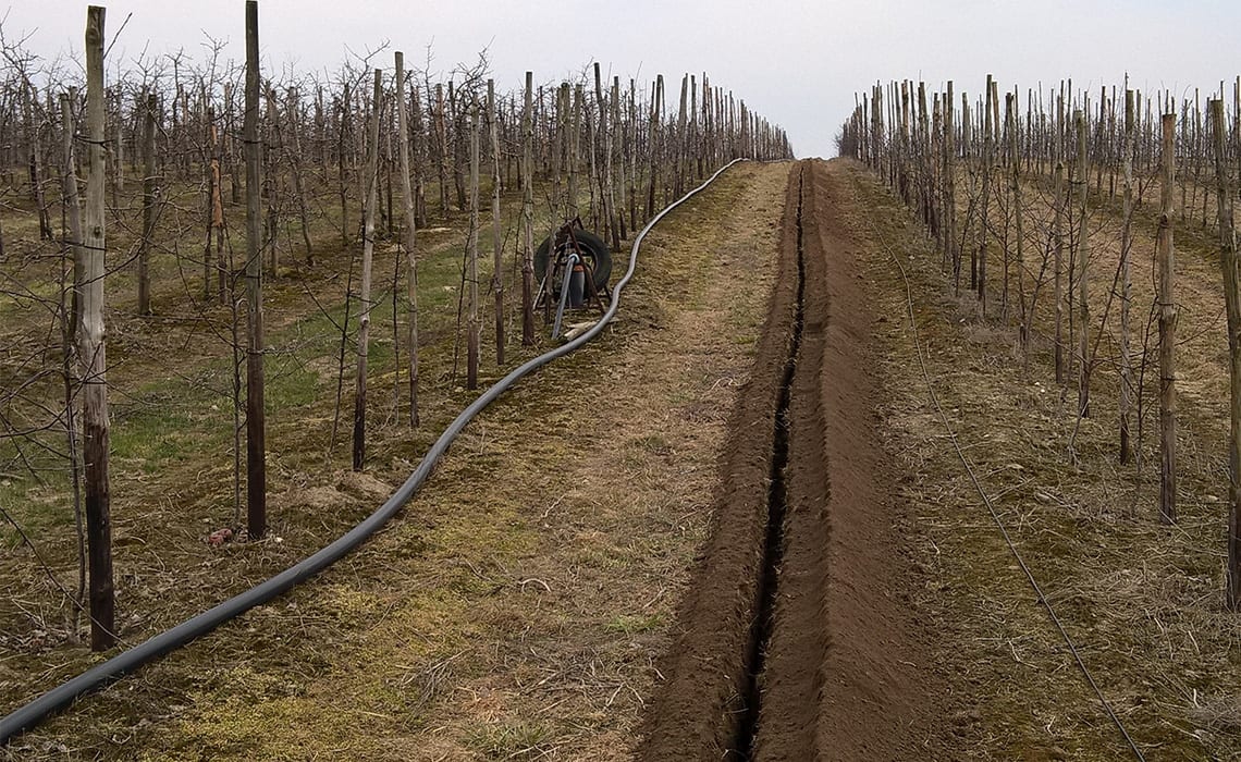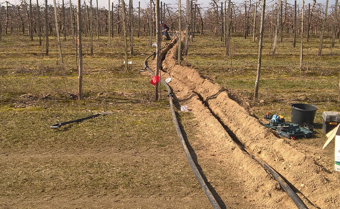 Sad wielogatunkowy w Niewierzu koło Brodnicy. Powierzchnia 17,5 ha. Duży sad a małe źródło wody – 9 m3/h. Wymusiło podzielenie całej powierzchni na 20 sekcji. Do tego zastosowano dwa filtry żwirowe T-620 płukane automatycznie co daje dodatkowo 2 sekcje. Zainstalowano sterownik Neptun co pozwoliło zaoszczędzić około 40% na automatyce. Sterownik ten pozwala klientowi z dowolnego miejsca na Ziemi sprawdzać działanie systemu, zarządzać nim oraz otrzymywać wiele cennych informacji jak np. ilość opadu bardzo ważna do prawidłowej ochrony sadu. Ponadto zainstalowano dozownik nawozu Dosatron dzięki czemu sadownik ma pełną kontrolę nad nawożeniem.