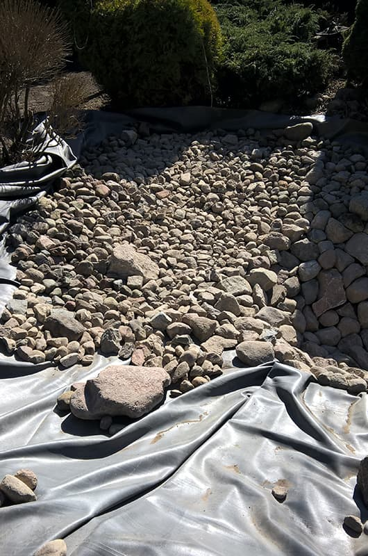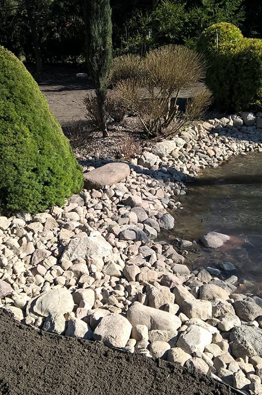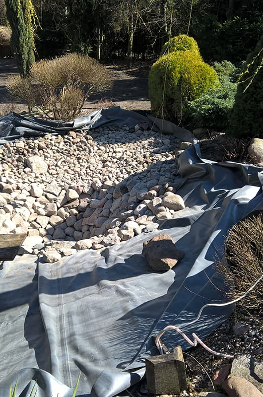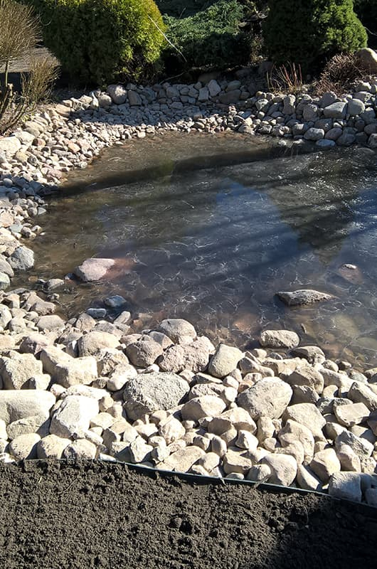 Nasz klient z Torunia poprosił nas o przebudowę oczka i rekultywację części trawnika. Oczko zostało pogłębione wyłożone geomembraną EPDM doskonale nadającą się do uszczelnienia. Następnie wyłożono otoczakami w taki sposób aby ściśle do siebie przylegały. Trawę wysialiśmy wysokiej jakości Kiepenkerl Majestic Aktiv.
