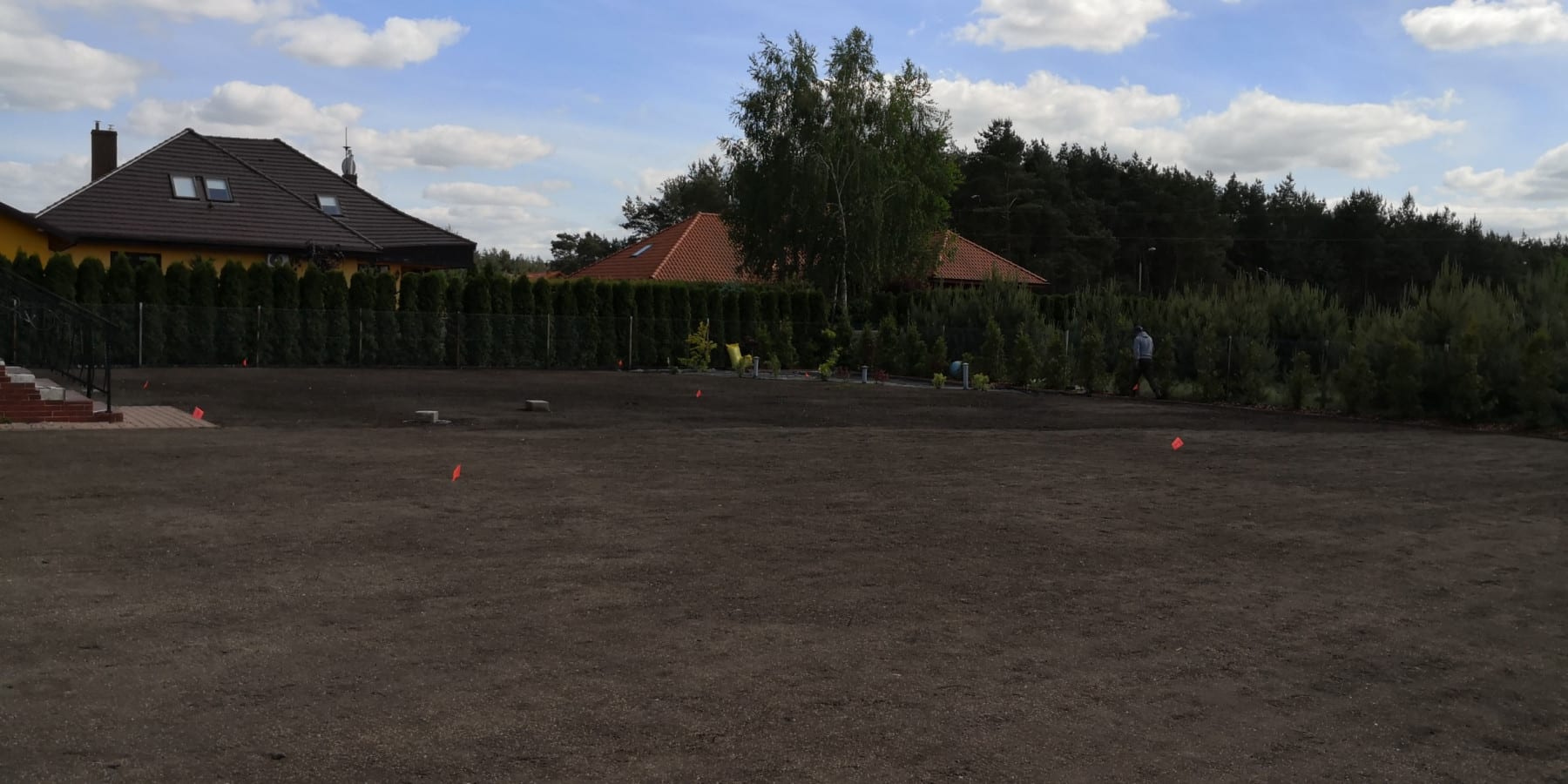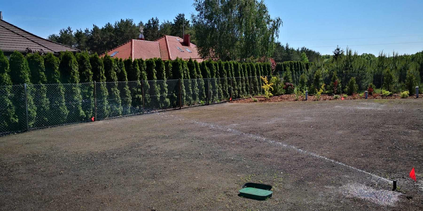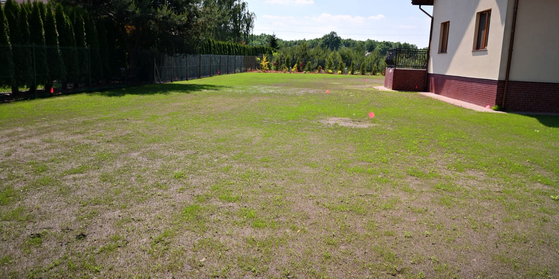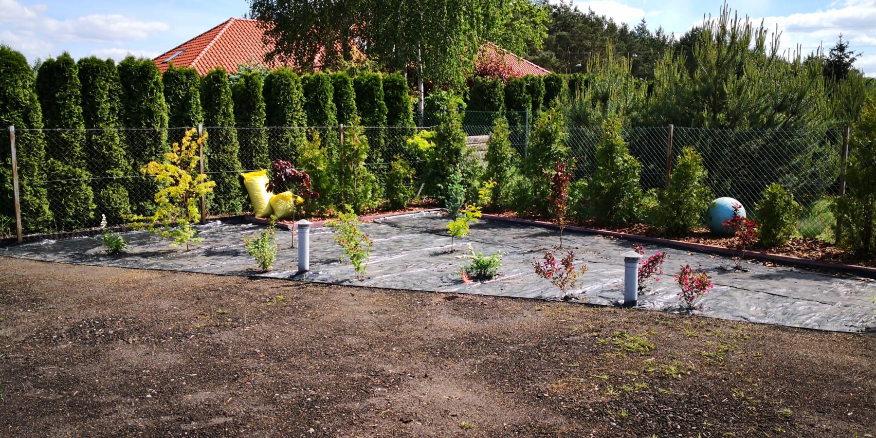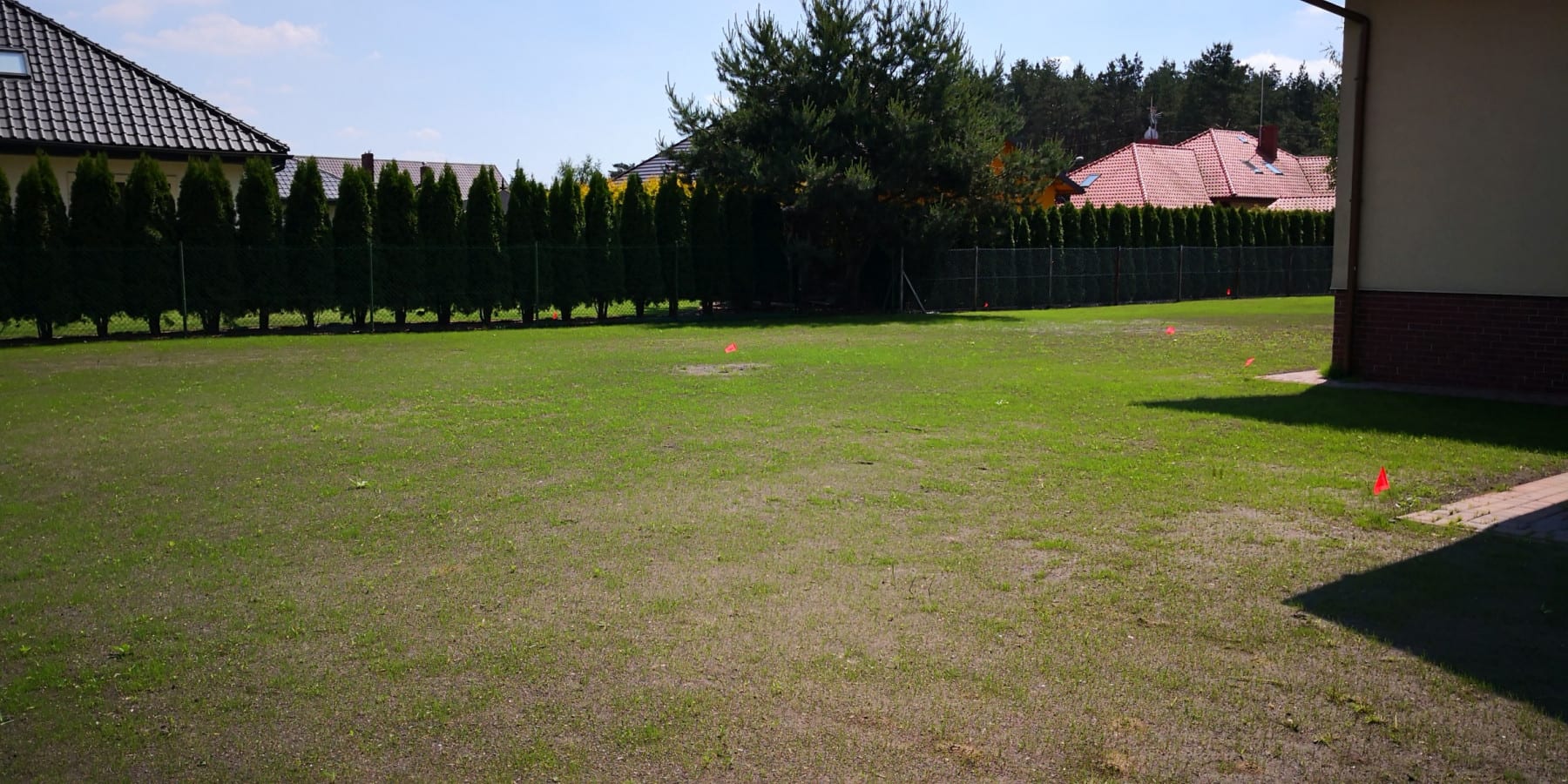 Duża powierzchnia trawnika, rośliny w zasadzie tylko na obrzeżach ogrodu. Typowa praca polegająca na zbudowaniu systemu nawadniającego. W drugiej kolejności ułożenie siatki i siew trawy. Po posianiu trawy, w okolicy występowały silnie wiatry, które naniosły z okolicznych ugorów, nasiona chwastów, zwłaszcza chwastnicy. Niestety trzeba było wszystko usunąć ręcznie, aby gatunki szlachetne traw mogły się prawidłowo rozwijać. Zastosowano nawozy specjalistyczne Certo i trawa na koniec roku wyglądała wspaniale.