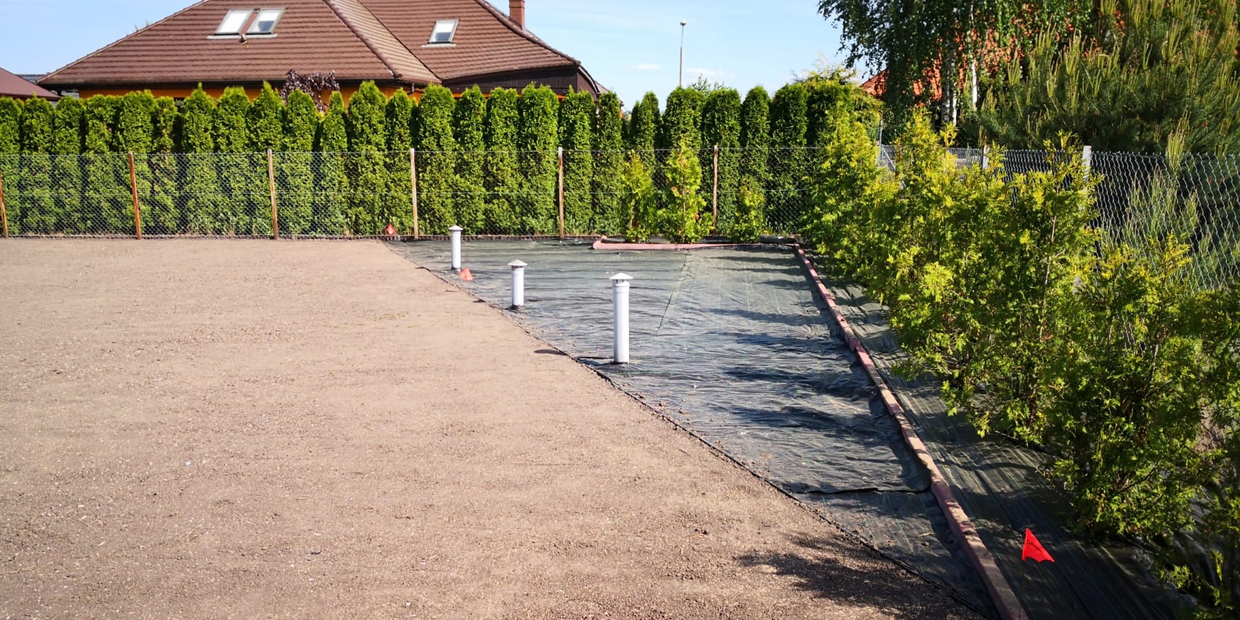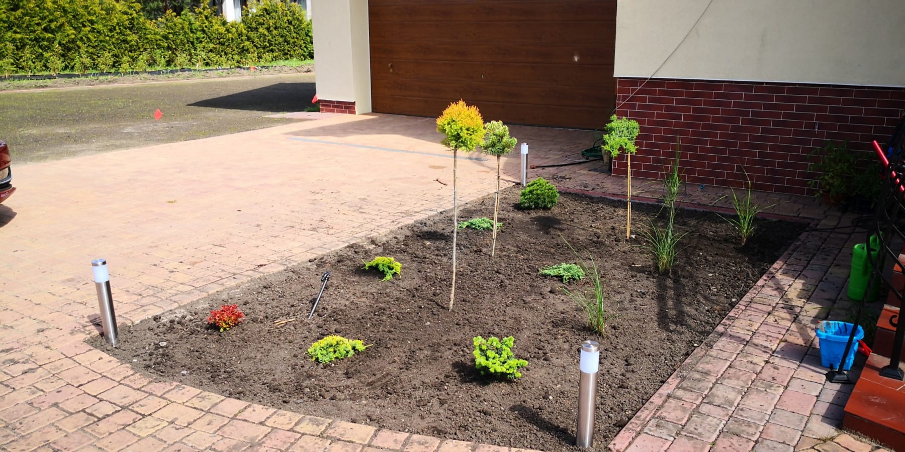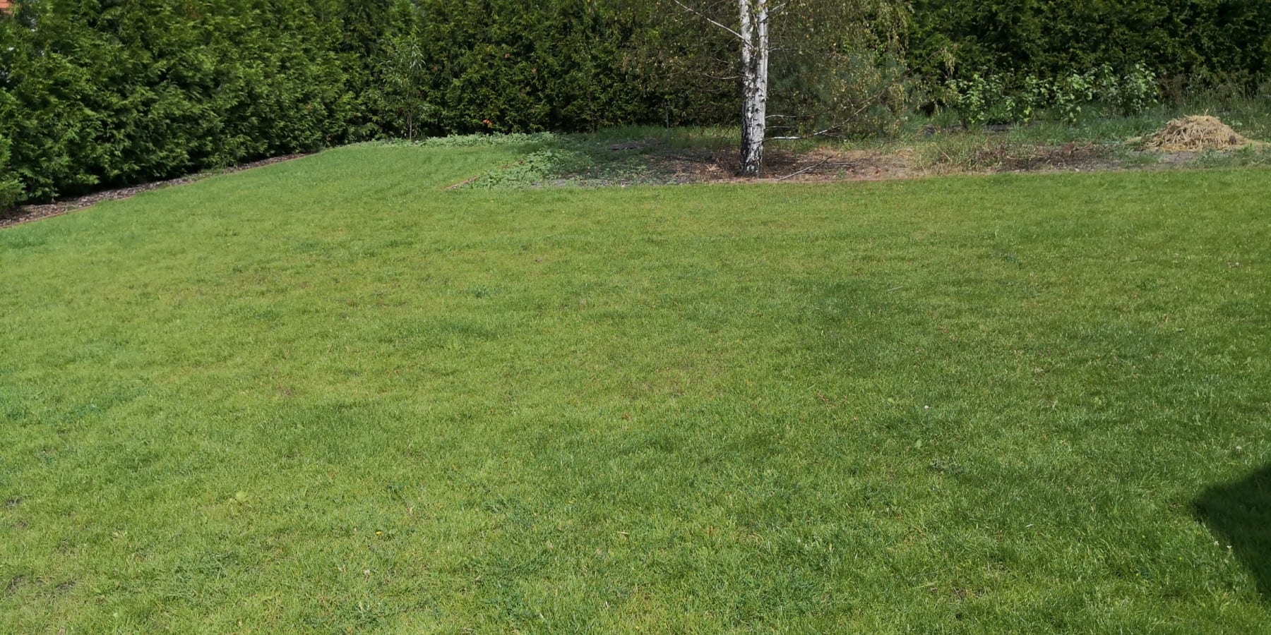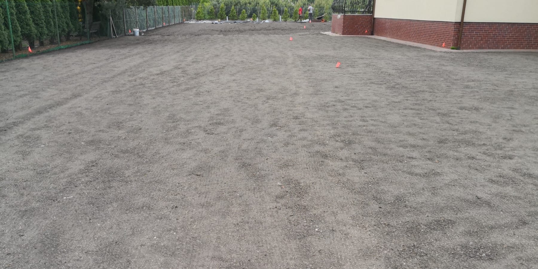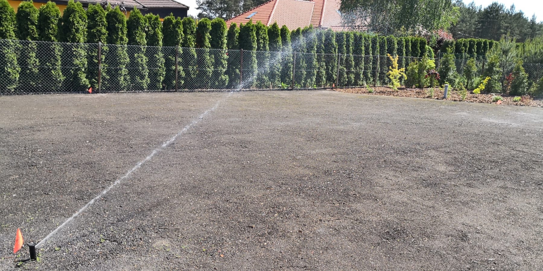 Duża powierzchnia trawnika, rośliny w zasadzie tylko na obrzeżach ogrodu. Typowa praca polegająca na zbudowaniu systemu nawadniającego. W drugiej kolejności ułożenie siatki i siew trawy. Po posianiu trawy, w okolicy występowały silnie wiatry, które naniosły z okolicznych ugorów, nasiona chwastów, zwłaszcza chwastnicy. Niestety trzeba było wszystko usunąć ręcznie, aby gatunki szlachetne traw mogły się prawidłowo rozwijać. Zastosowano nawozy specjalistyczne Certo i trawa na koniec roku wyglądała wspaniale.