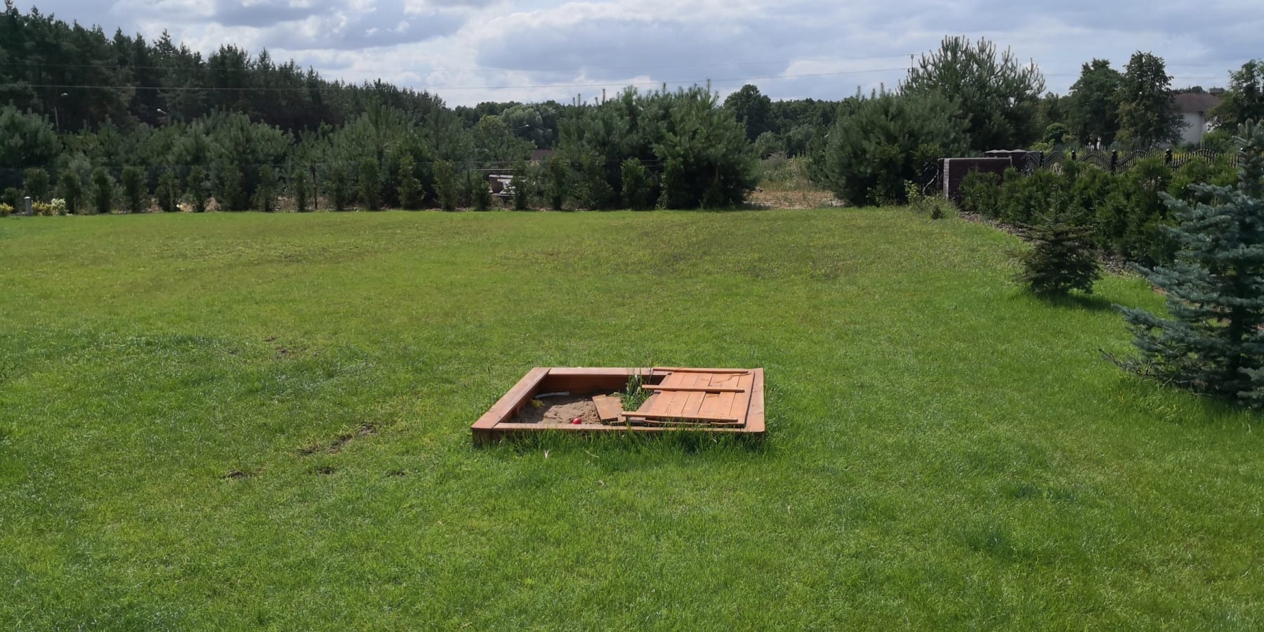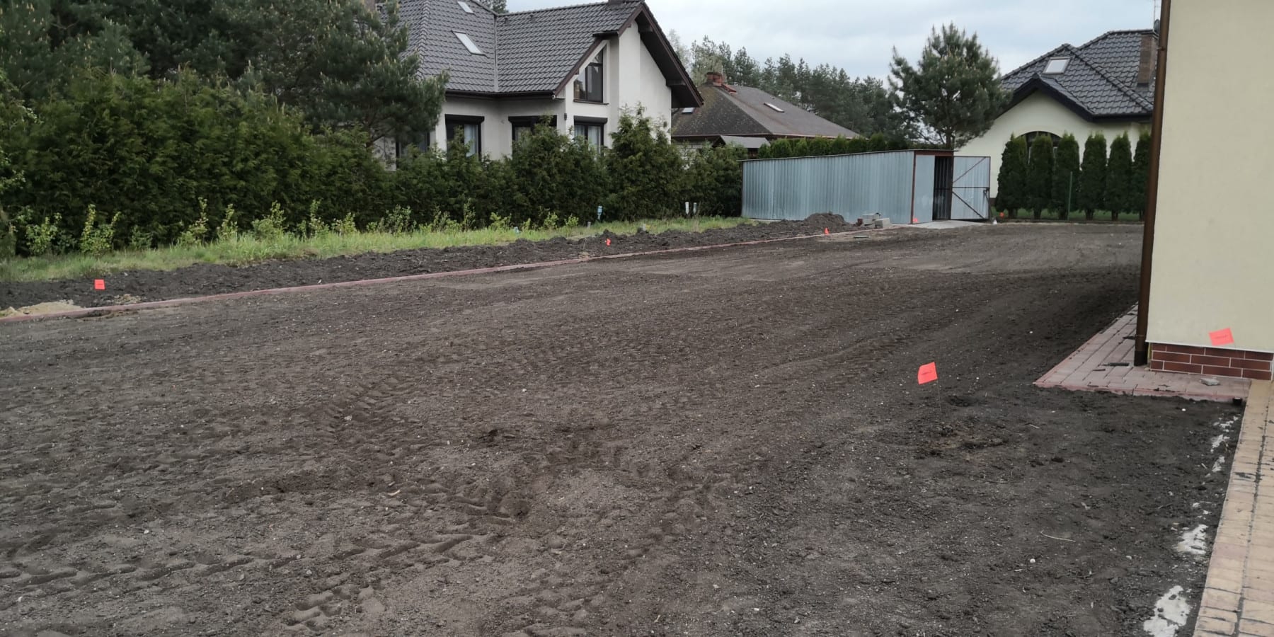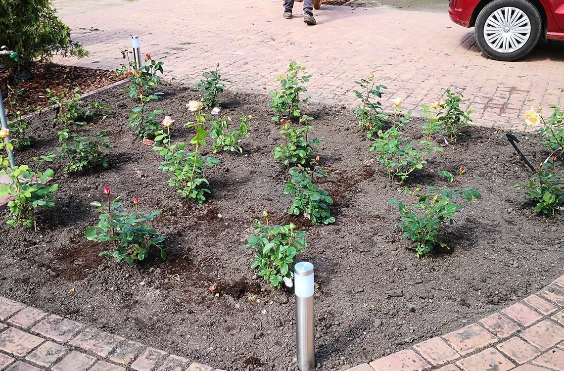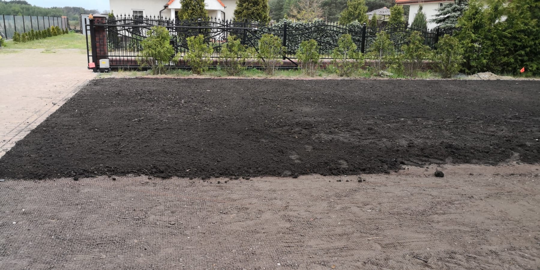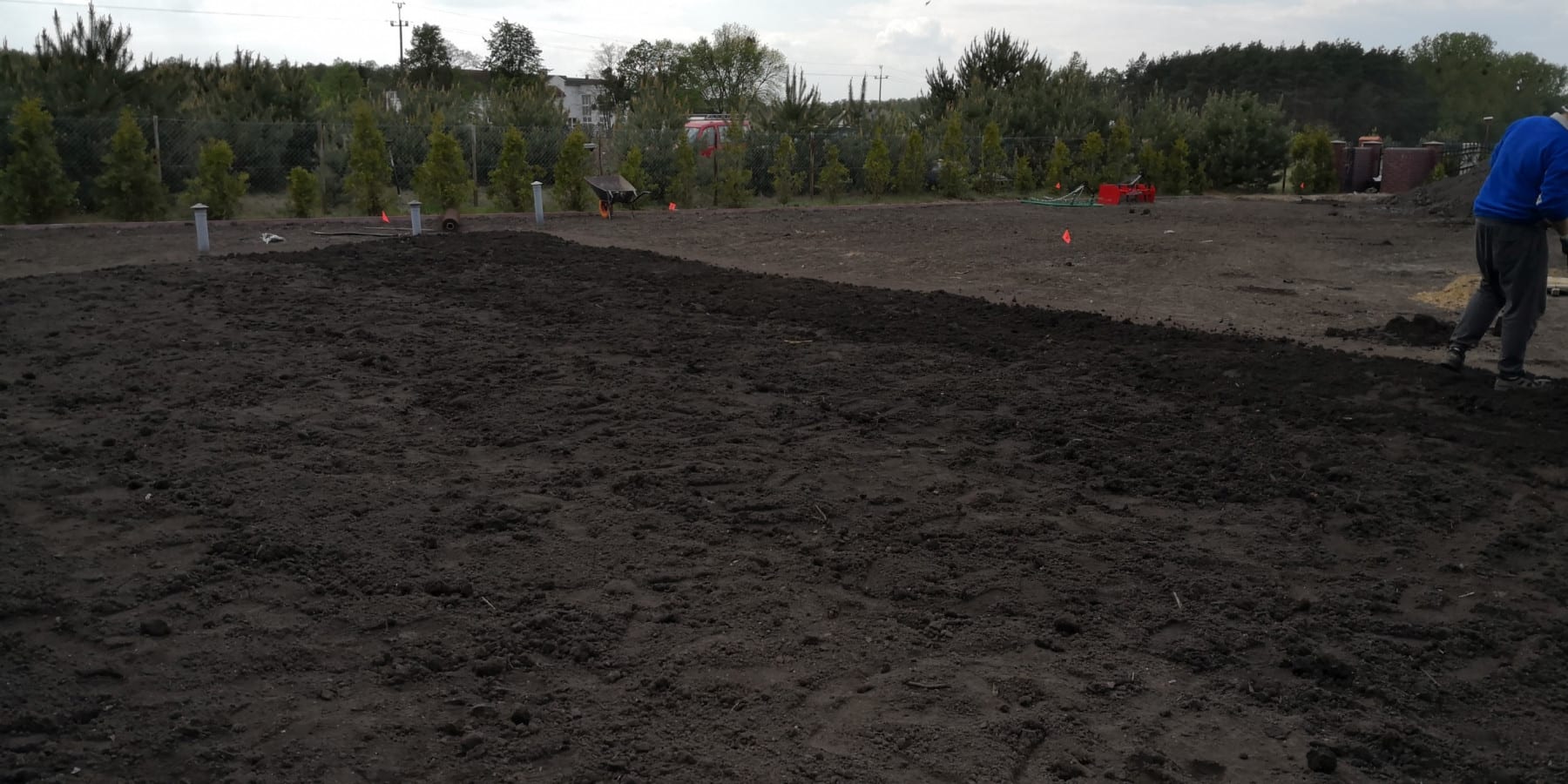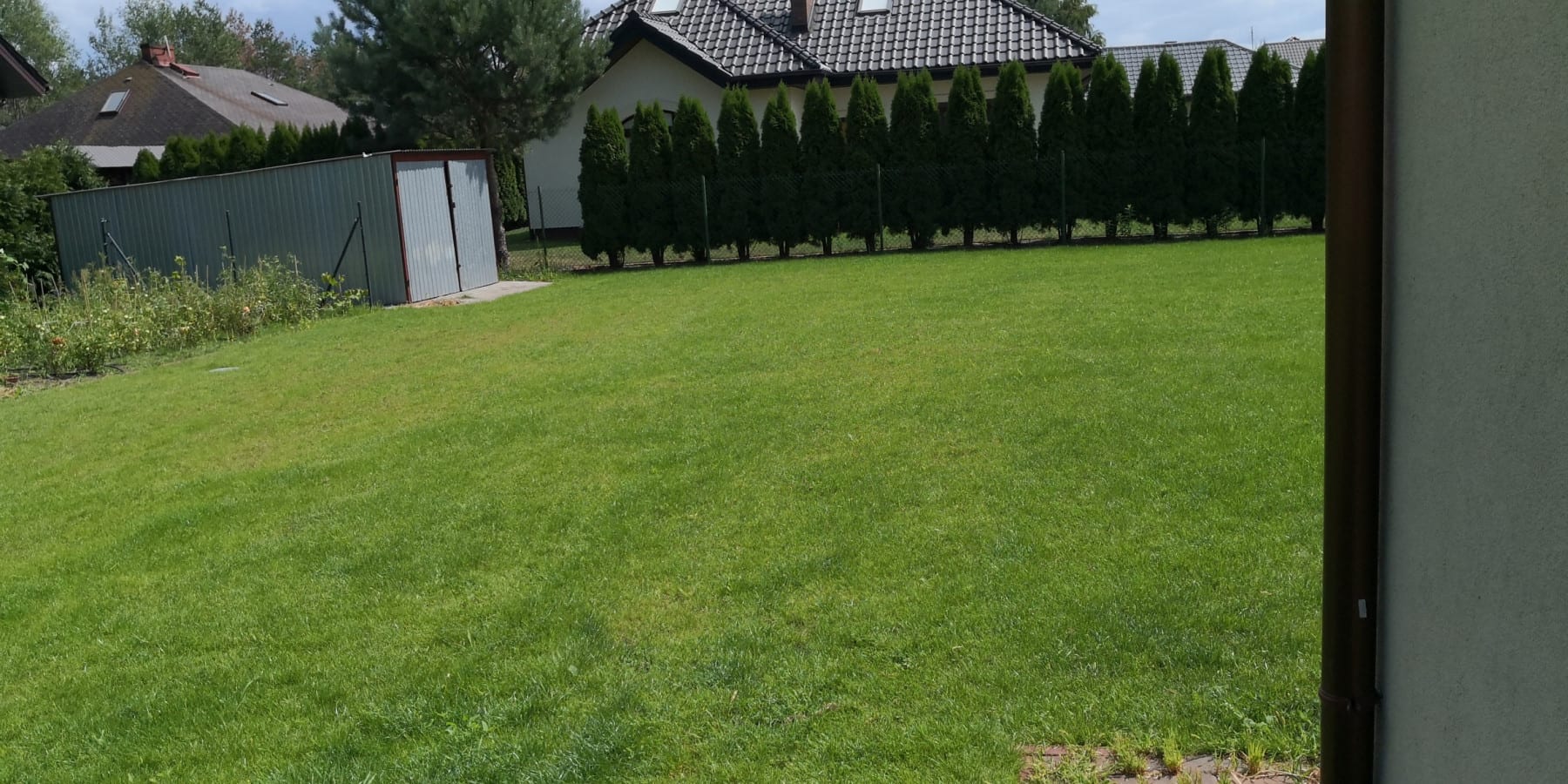 Duża powierzchnia trawnika, rośliny w zasadzie tylko na obrzeżach ogrodu. Typowa praca polegająca na zbudowaniu systemu nawadniającego. W drugiej kolejności ułożenie siatki i siew trawy. Po posianiu trawy, w okolicy występowały silnie wiatry, które naniosły z okolicznych ugorów, nasiona chwastów, zwłaszcza chwastnicy. Niestety trzeba było wszystko usunąć ręcznie, aby gatunki szlachetne traw mogły się prawidłowo rozwijać. Zastosowano nawozy specjalistyczne Certo i trawa na koniec roku wyglądała wspaniale.