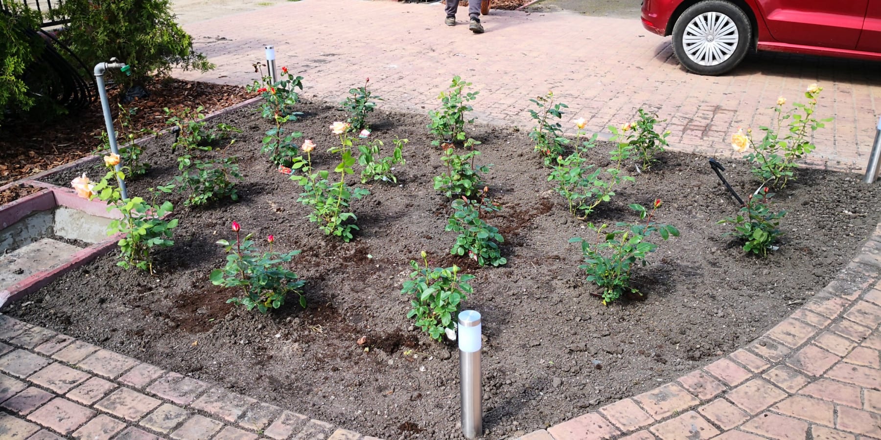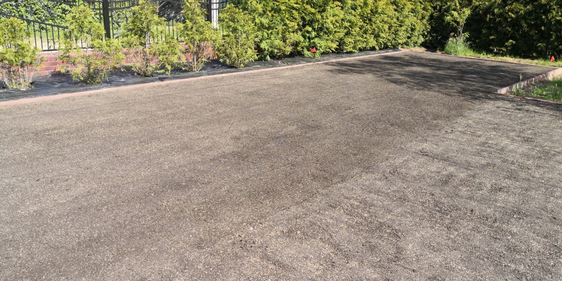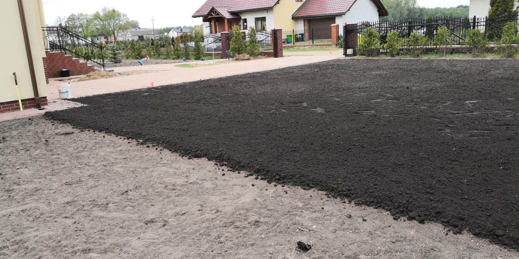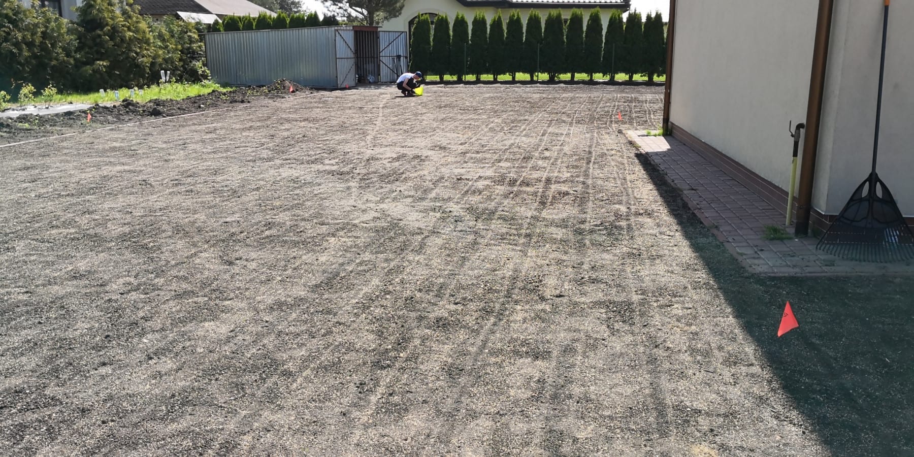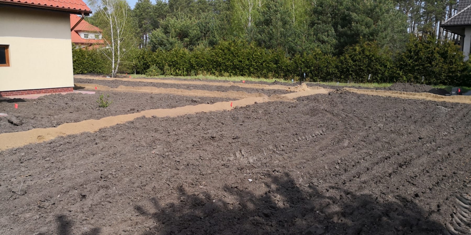 Duża powierzchnia trawnika, rośliny w zasadzie tylko na obrzeżach ogrodu. Typowa praca polegająca na zbudowaniu systemu nawadniającego. W drugiej kolejności ułożenie siatki i siew trawy. Po posianiu trawy, w okolicy występowały silnie wiatry, które naniosły z okolicznych ugorów, nasiona chwastów, zwłaszcza chwastnicy. Niestety trzeba było wszystko usunąć ręcznie, aby gatunki szlachetne traw mogły się prawidłowo rozwijać. Zastosowano nawozy specjalistyczne Certo i trawa na koniec roku wyglądała wspaniale.